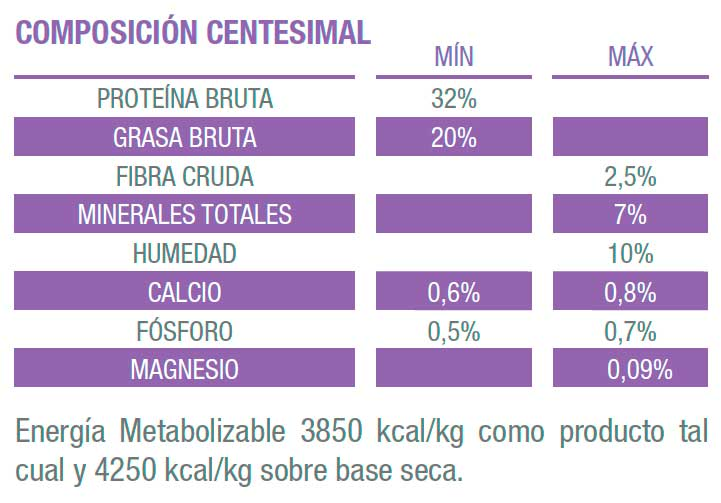 - Aporta proteínas de alto valor biológico y digestibilidad provenientes del pollo y huevo.